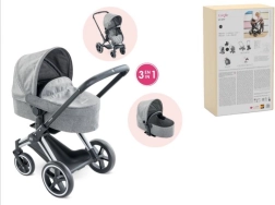 Stilski voziček za punčke, navdihnjen z izvirnim modelom CYBEX PRIAM, ponuja funkcijo 3 v 1 – voziček, globoka košara in prenosna posteljica. Ima nastavljivo strehico, odstranljiv varovalni lok, robustno košaro in ga je mogoče zlahka nagniti in zložiti. Primeren za punčke velikosti 36–52 cm.