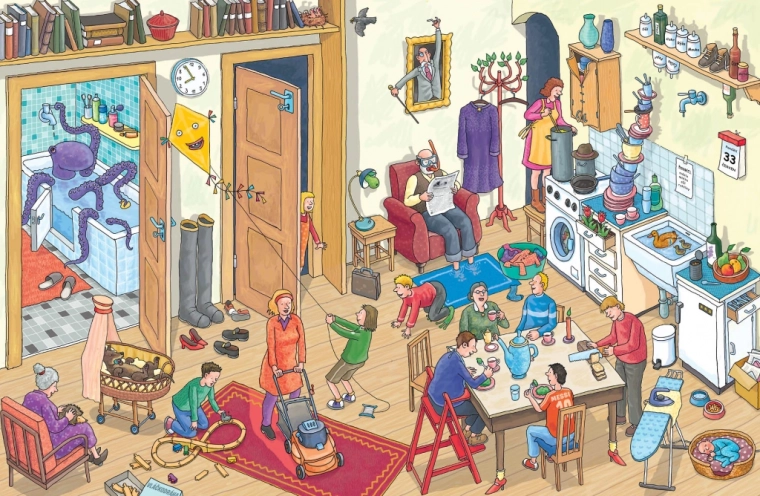 Od hobotnice v kadi do kosilnice na preprogi – vsaka scena sproži smeh in vprašanja. Odlično za urjenje pozornosti in bogatenje besedišča.