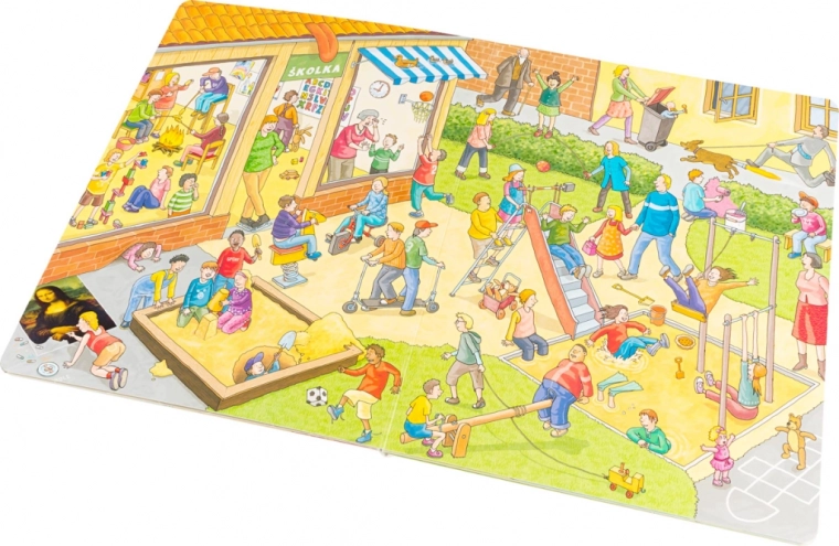Ta velikoformatna knjiga vabi otroke v pisane prizore, polne veselih nesmislov – od domačega kaosa do prometnih ulic in igrivih podeželskih dogodivščin. Vsaka stran je bogato ilustrirana in polna drobnih zgodbic, ki vabijo k odkrivanju, pripovedovanju in skupnemu smehu.