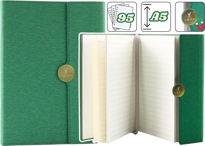 Zeleni pisarniški zvezek A5 z magnetnim zapiranjem in črtami