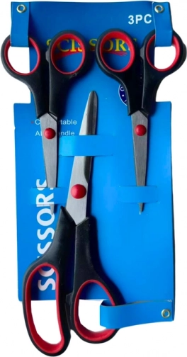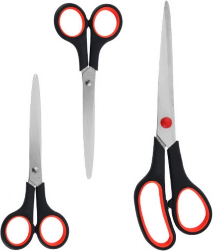 Praktičen set treh univerzalnih pisarniških škarij za vsakodnevno uporabo v gospodinjstvu, pisarni in delavnici. Vsebuje velikosti 20 cm, 14 cm in 12,5 cm za različna opravila. Ostri rezili iz nerjavnega jekla zagotavljata gladek in natančen rez, ergonomski plastični ročaji pa nudijo udoben oprijem tudi pri daljšem delu. Set je odporen proti koroziji in ima certifikat CE.