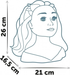 Glava za česanje za ustvarjanje trendovskih pričesk. Z magično funkcijo: uporabi priloženi čopič za ustnice, namočen v hladno vodo, in ustnice se lepo obarvajo. Vsebuje 19 kosov dodatkov, ki jih lahko shraniš v skritem skrivališču v podstavku glave. Opremljeno s priseski na spodnjem delu podstavka za boljšo stabilnost. Višina glave 26 cm.