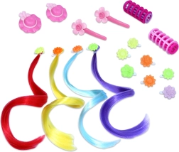 • Kompleten set pripomočkov – glavnik, »kodralnik«, sponke in barvni prameni.