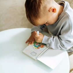 Vodni čopič razkrije barve na strani, po sušenju pa slika izgine. Idealno za večkratno igro doma in na poti.