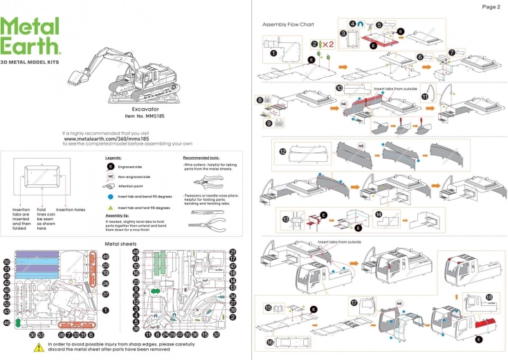 V paketu najdete 2 jekleni ploščici z delčki in pregleden priročnik. Delci se povezujejo s pomočjo zaskočnih jezičkov – dovolj je, da jih previdno upognete z majhnimi kleščami in korak za korakom sestavite celoto. Orodje ni priloženo.