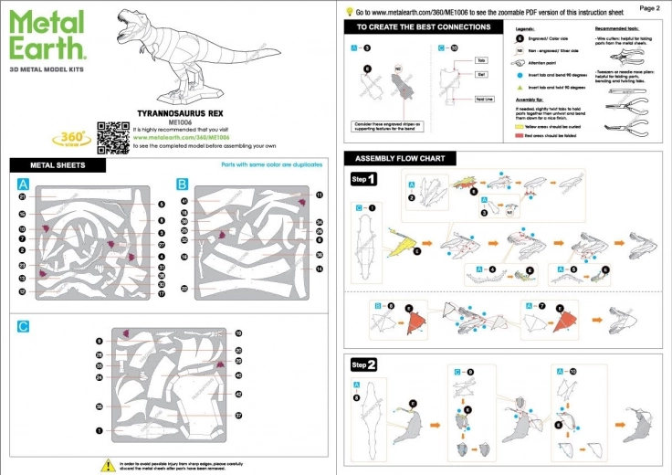 Sestavljanje poteka z upogibanjem in zaskočnim povezovanjem delcev s pomočjo zatičev – brez lepila. Za udobno montažo priporočamo majhne strižne klešče in tanke ploščate kleščice (niso priložene). Končni model meri približno 18,5 × 9,6 × 6 cm in bo stilski dodatek za ljubitelje dinozavrov, modelarje in tehnične navdušence.