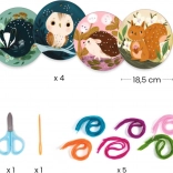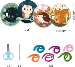 - 4 kartonski krogi z luknjami, 20 pramenov volne (50 cm), 5 barv, 1 igla, 1 par škarij, 1 knjižica