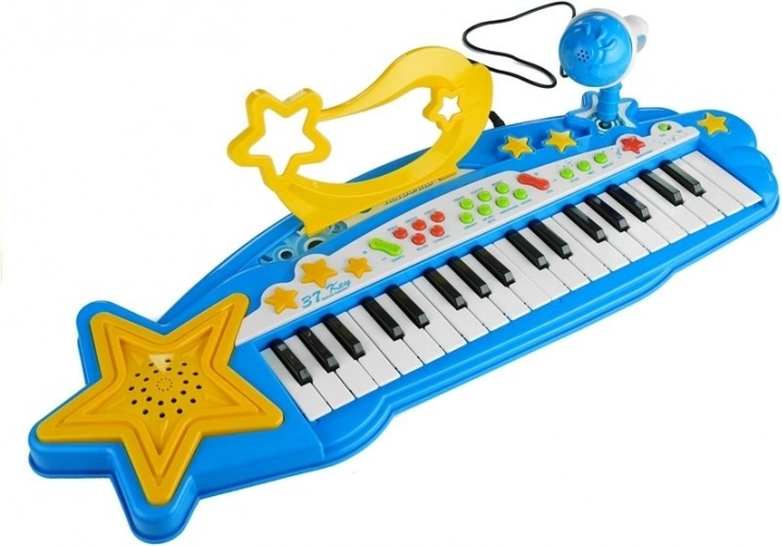 Odkrijte veselje do glasbe z otroškim klaviaturom s 37 tipkami, ki združuje igriv dizajn s praktičnimi funkcijami. Barvna izvedba z zvočnikom v obliki zvezde, vgrajene melodije in priključljiv mikrofon spodbujajo otroke k ustvarjanju, petju in prvim glasbenim poskusom. Zahvaljujoč vhodu MP3 lahko igrajo in pojejo tudi svoje najljubše pesmi.