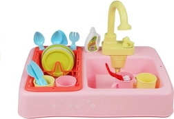 Korito deluje na 3x 1,5V baterije tipa “AA”, ki niso priložene. Po vstavitvi baterij v igračo in premiku stikala v položaj “ON” pipa vsrka vodo in lahko začnete z igro pomivanja.