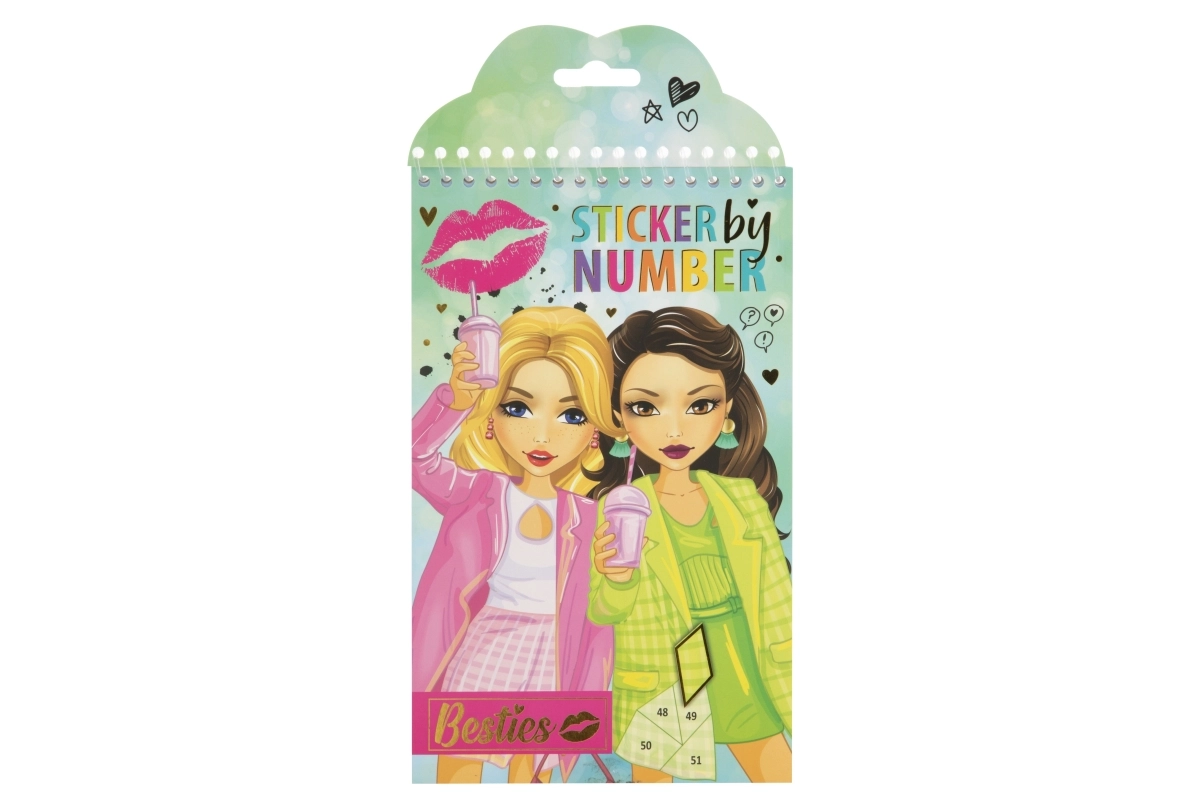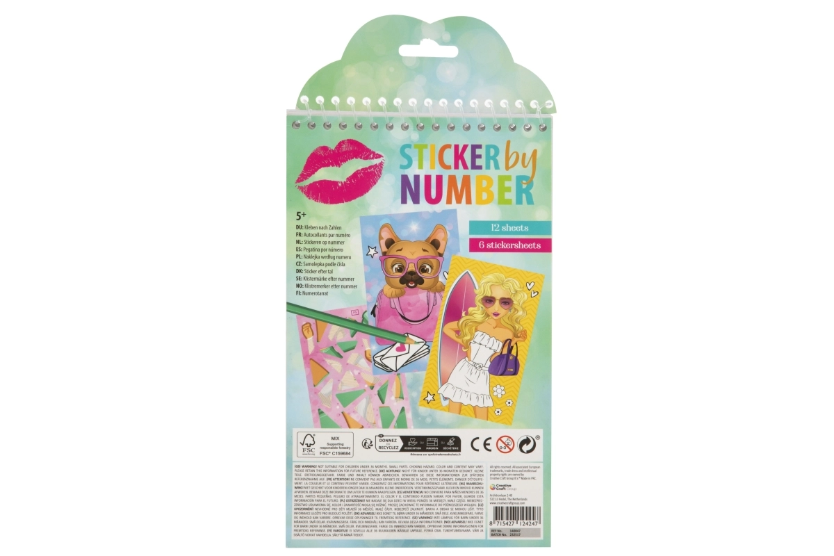 Nalepke po številkah. Dekliški motiv. Blok vsebuje 6 listov z nalepkami in 12 listov kot lepilno površino. Dimenzije 15 × 24,5 × 0,5 cm. Priporočena starost 5+.