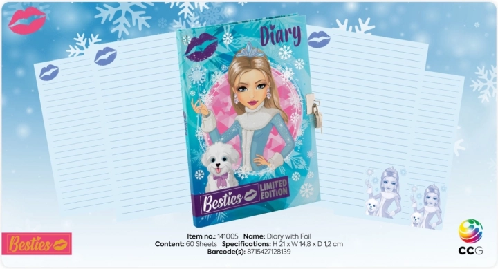 Stilski dekliški dnevnik z varno ključavnico in dvema ključema je idealen za skrivne zapiske, sanje in vsakodnevne dogodivščine. Ima 60 črtnih listov, praktičen format 15 × 21 × 1 cm in vesel zimski dizajn z motivom Besties – deklica in kužek. Odlično darilo za otroke od 5 let.