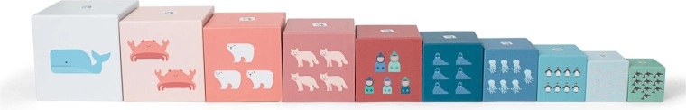Ta zložljiva piramida vsebuje 10 kock postopno manjših dimenzij. Otroci lahko zgradijo stolp po številčnem zaporedju in slikah živali ali kocke razporedijo drugo ob drugo. Med igro na nevsiljiv način urijo štetje, koncentracijo in prostorsko zaznavanje.