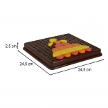 Ta mozaikova sestavljanka prinaša otrokom neomejene možnosti ustvarjanja. Barvni geometrijski kosi se vstavljajo v perforirano ploščo, otroci pa lahko ustvarjajo lastne slike ali se navdihujejo s priloženimi karticami. Igra naravno razvija koordinacijo oko-roka, vidno zaznavanje in sposobnost razlikovanja barv in oblik.