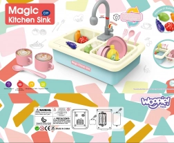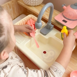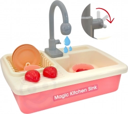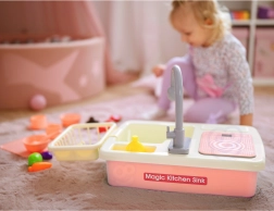 Rožnato otroško kuhinjsko korito s pravim kroženjem vode spremeni pospravljanje v zabavo. Podpira učenje domačih opravil, razvoj fine motorike in kreativno igro zahvaljujoč bogatemu kompletu posode, živil in dodatkov.