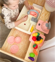 Otroci se zlahka igrajo kuharje in pomočnike v gospodinjstvu: strežejo, režejo, pomivajo in pospravljajo. Tako si na nevsiljiv način osvojijo osnove higiene in ekološki pristop k vodi, medtem ko starši cenijo bolj pospravljen igralni kotiček.