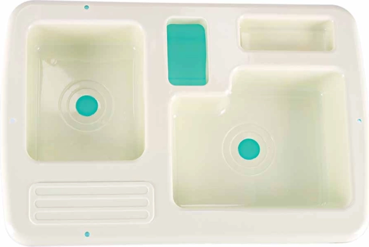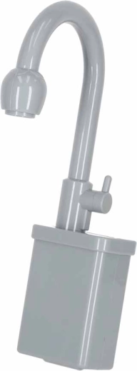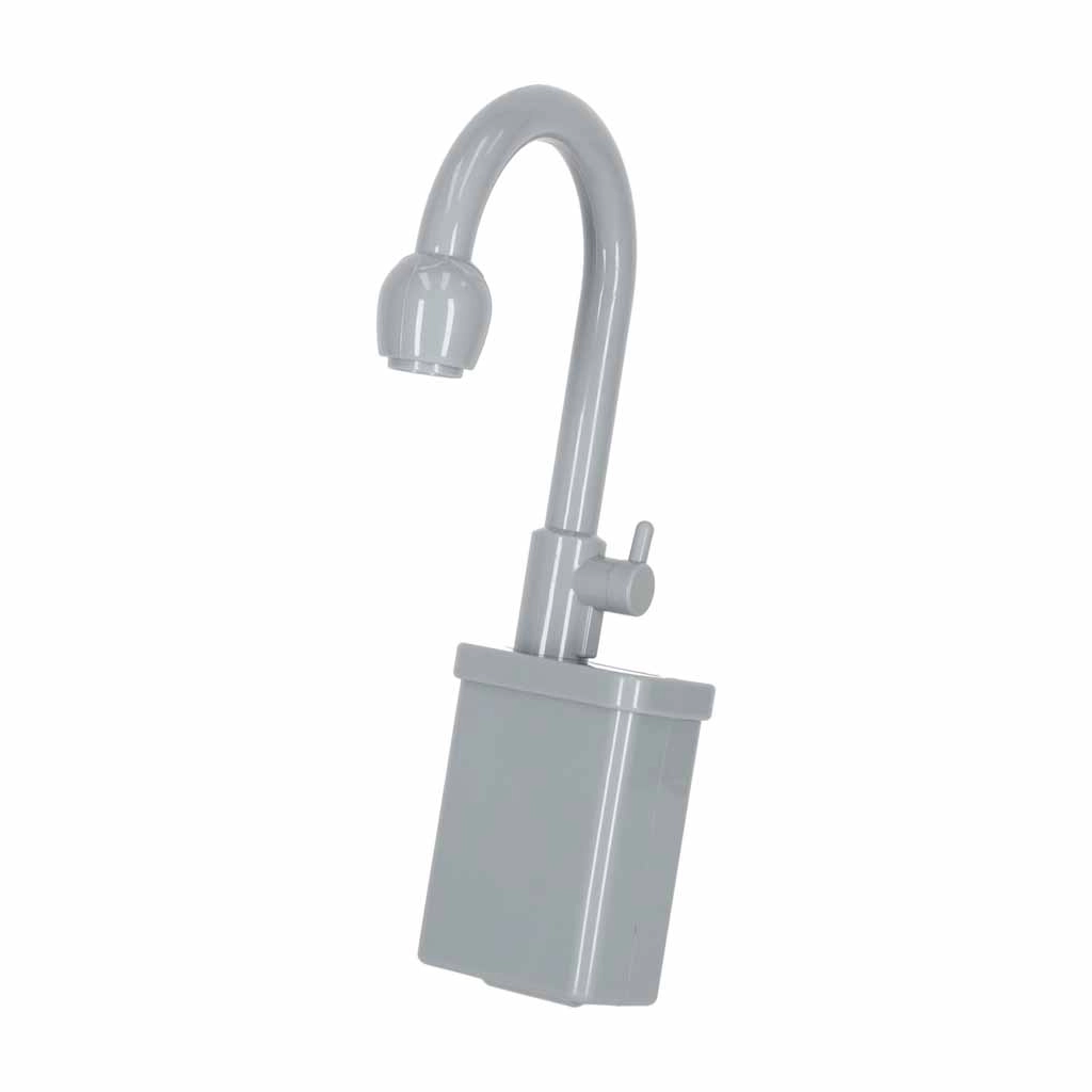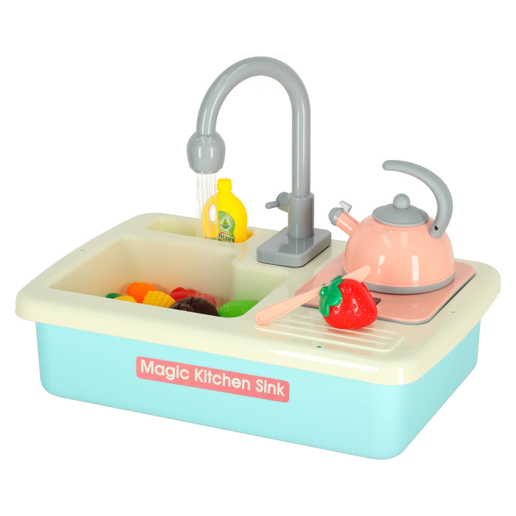 Delujoča pipa s črpalko kroži vodo po vstavitvi 2× AA baterij. Otroci lahko izpirajo posodice in “živila” kot pri pravem koritu.