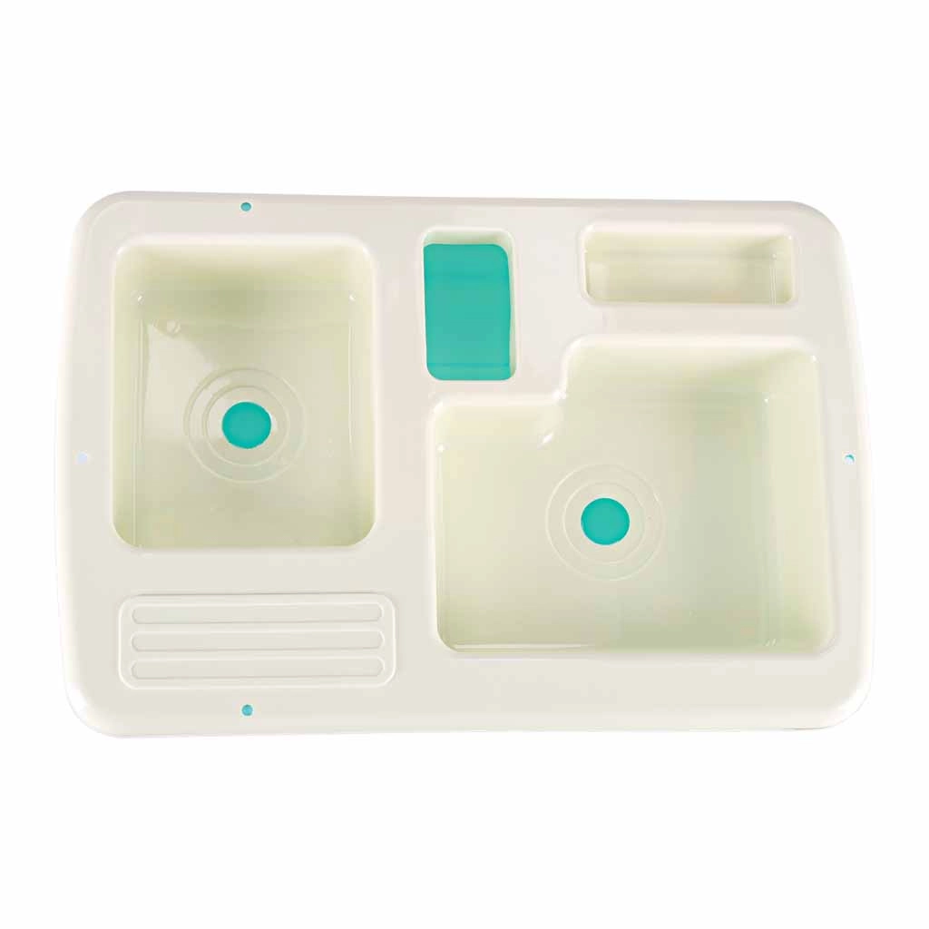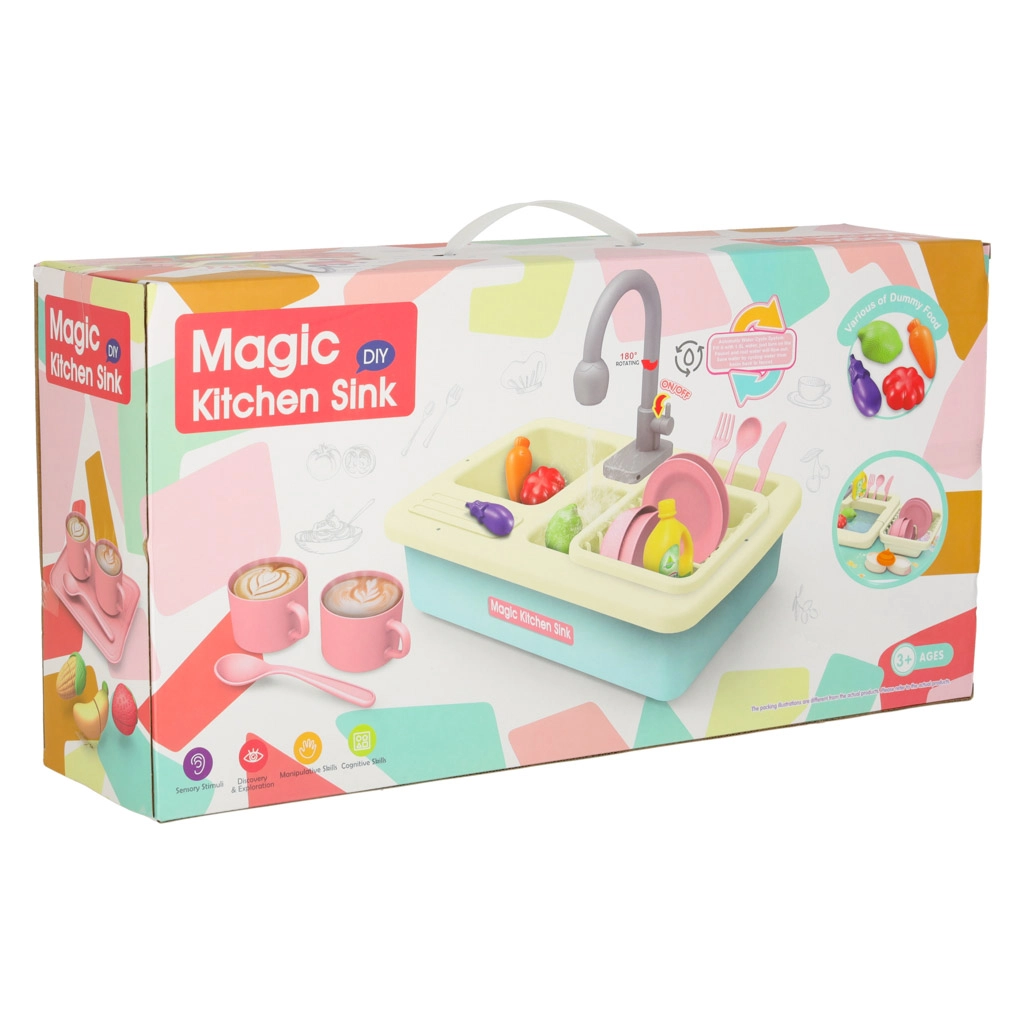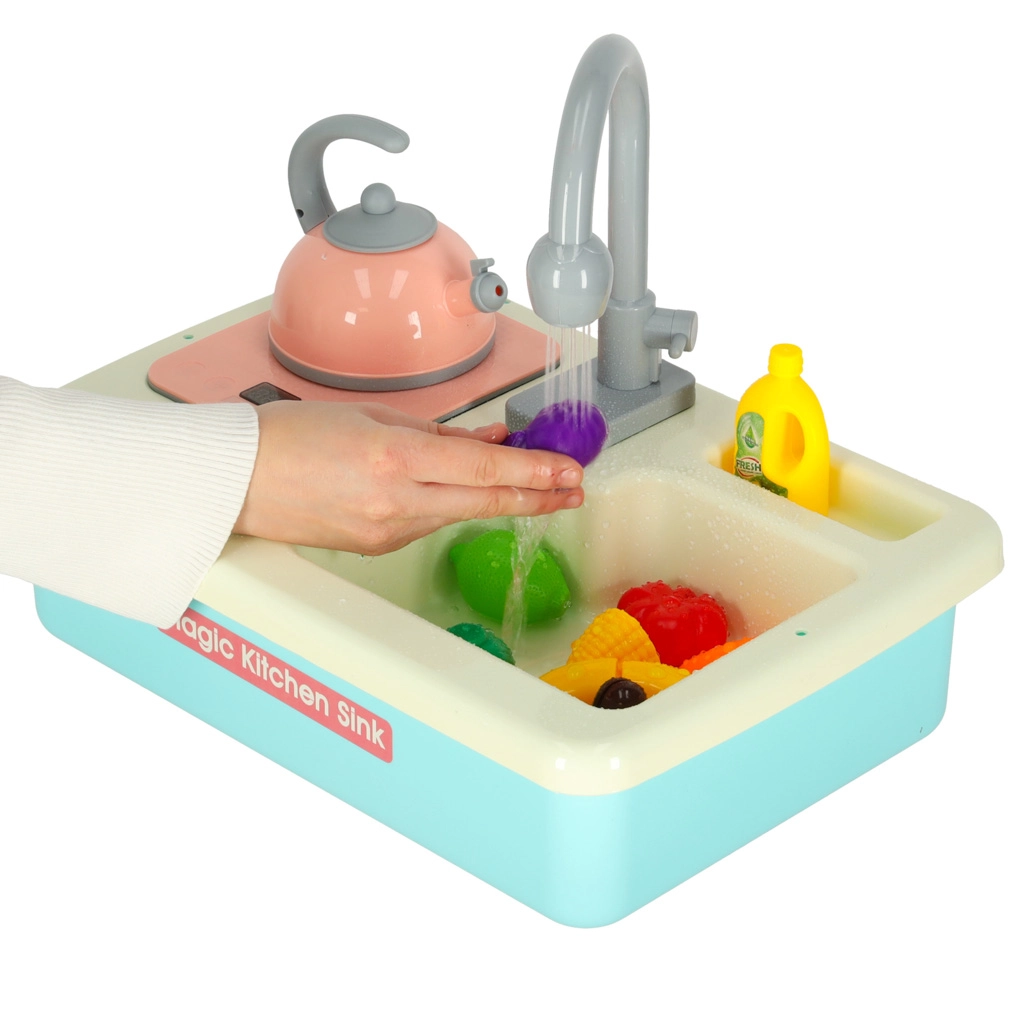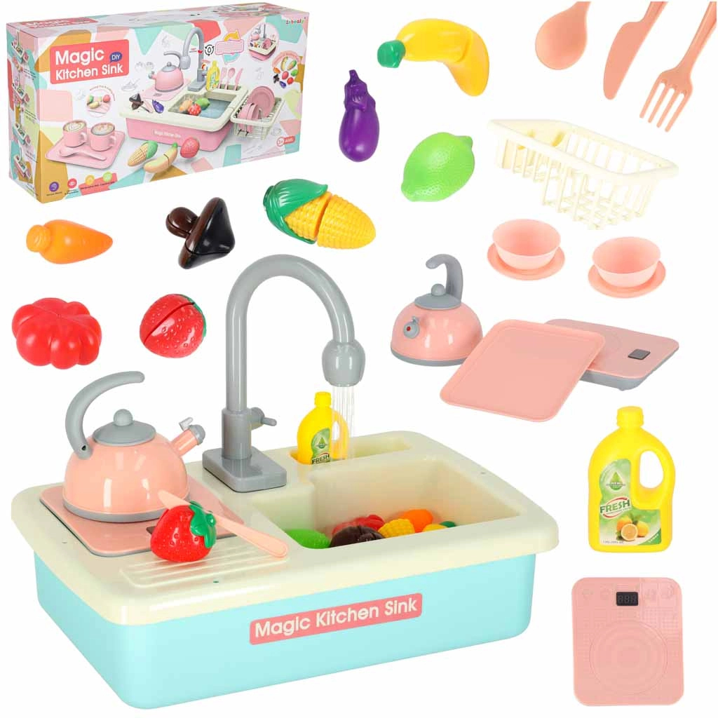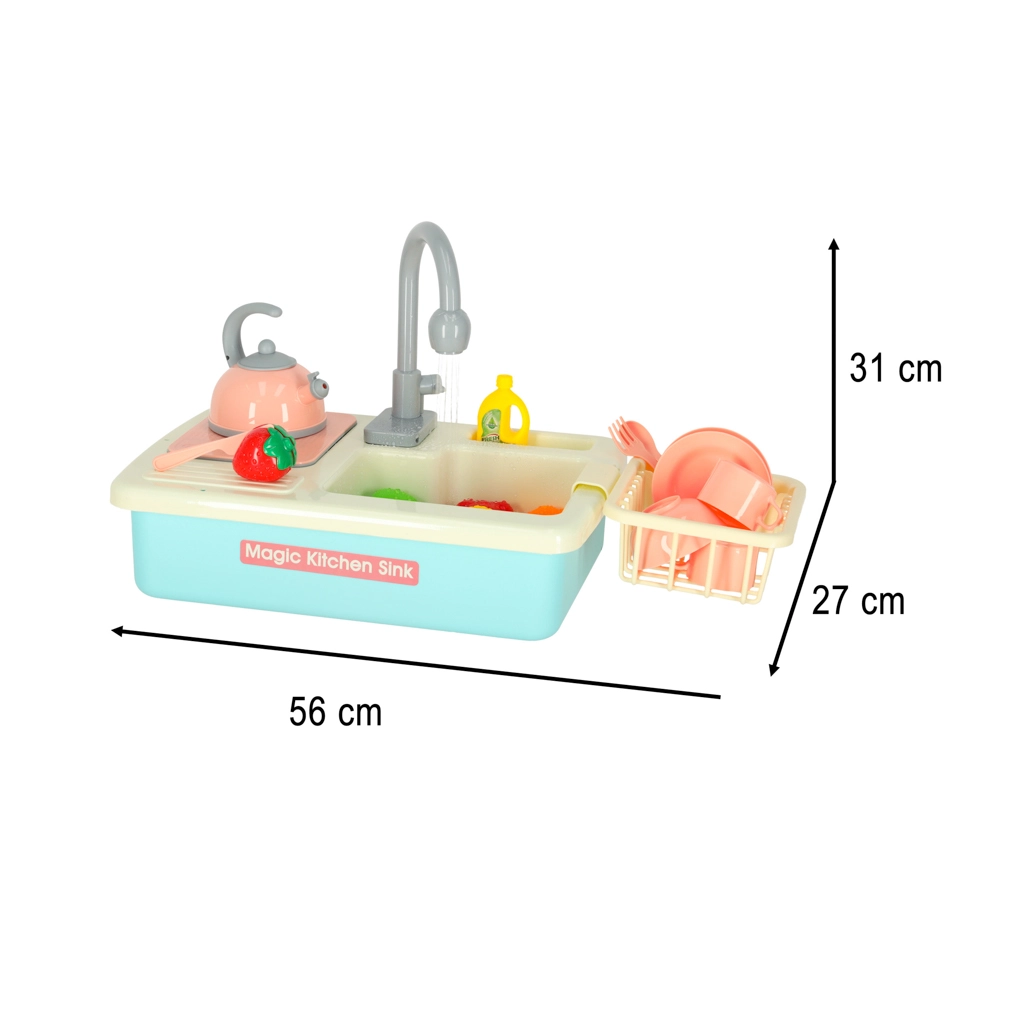 To realistično otroško korito deluje skoraj kot pravo – po vstavitvi baterij črpalka zažene kroženje vode, zato lahko otroci pomivajo posodice in se učijo odgovornosti v kuhinji. Igra hkrati naravno vodi k zavedanju varčevanja z vodo ter podpira praktične veščine.