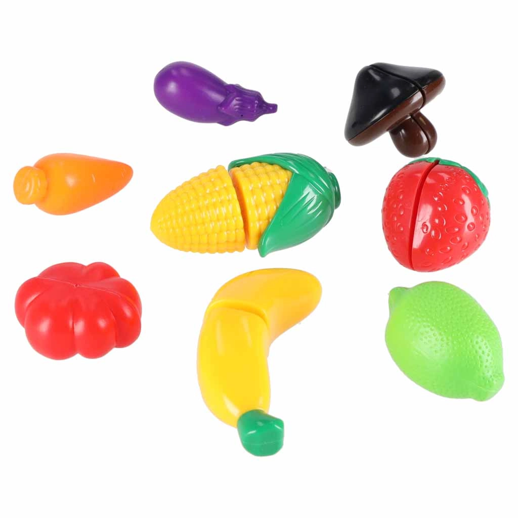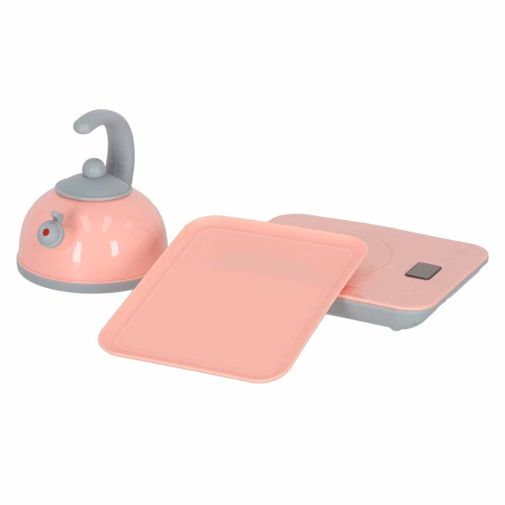 - korito, “kuhalna plošča/kuhinjica”, čajnik, deska za rezanje, 2× skodelica, 2× krožnik, 2× lonček, pribor (žlica, vilice, nož), plastični dodatki in živila (npr. paradižnik, limeta, jajčevec, banana, jagoda, koruza, goba, korenček)