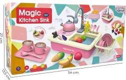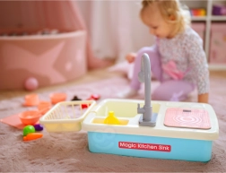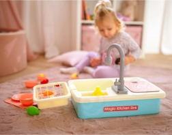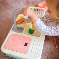 Zabavno otroško kuhinjsko korito s kroženjem vode na 2× AA baterije spremeni učenje domačih opravil v igro. Priloženi so bogati dodatki za ustvarjalno kuhanje in pomivanje posode. Podpira fino motoriko, kreativnost in učenje ekologije ter urejenosti. Realistična tekoča pipa ter pisana zbirka posod in živil zagotavljata dolge ure varne zabave.