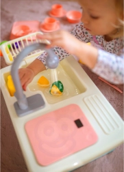 Privoščite otrokom njihov lasten kuhinjski kotiček. Realistično korito z delujočo vodno črpalko (napajanje 2× AA, niso priložene) omogoča izpiranje posode kot v pravi kuhinji. Bogat nabor dodatkov spodbuja domišljijo, učenje pravilnih navad in razvoj koordinacijskih spretnosti.