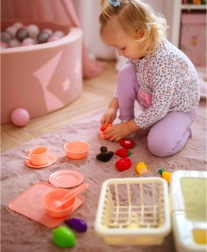 Set vsebuje krožnike, sklede, lončke, pribor, čajnik, rezalno desko in plastična živila na ježka (sadje in zelenjava) za varno “rezanje”. Otroci lahko pripravijo meni, postrežejo in nato posodo pomijejo – od igre do odgovornosti je le korak.