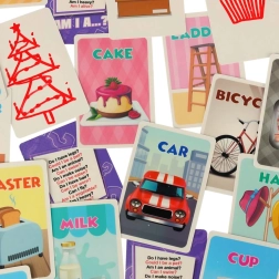 Del igre je 42 kart z raznolikimi slikami in napisi v angleščini. Poleg tega je priloženih 8 praznih kart za lastno ustvarjanje ugibalnih kart. Čas vsake runde meri peščena ura, kar igri doda dinamiko in tekmovalnost.