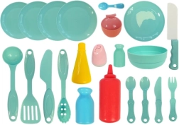 V kompletu je bogat nabor dodatkov: lonci in ponve, jedilni set s krožniki in skodelicami, pribor ter tudi sadje in zelenjava za rezanje in serviranje. Kuhinjica spodbuja kreativno igro, razvija fino motoriko, komunikacijo in domišljijo.