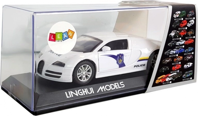 Policijski športni avto s pull-back pogonom, lučmi in zvoki. Gumijaste pnevmatike, CE/EN71, baterije AG13 v paketu. Odlično darilo za otroke od 3 let.