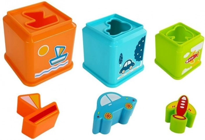 Odkrijte ustvarjalno igračo, ki raste z vašim otrokom. Komplet kvadratnih plastičnih lončkov različnih velikosti s potiski avtomobilov, ladij, raket in letal spodbuja domišljijo in naravno učenje. Zahvaljujoč številkam na spodnji strani lahko otroci naredijo prve korake v štetju in hkrati razvijajo spretnost.