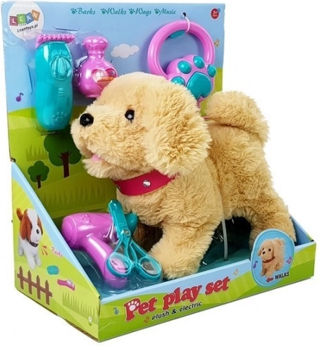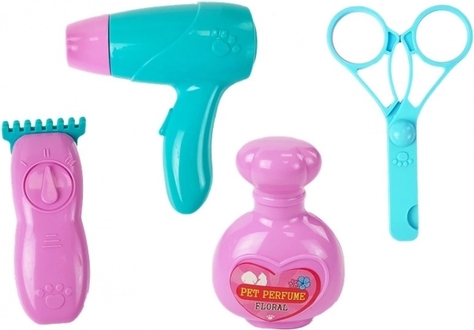 Set vključuje sušilnik, strojček, škarje in »parfum«, da lahko otroci kužka češejo, okrašujejo in zanj skrbijo kot v salonu.