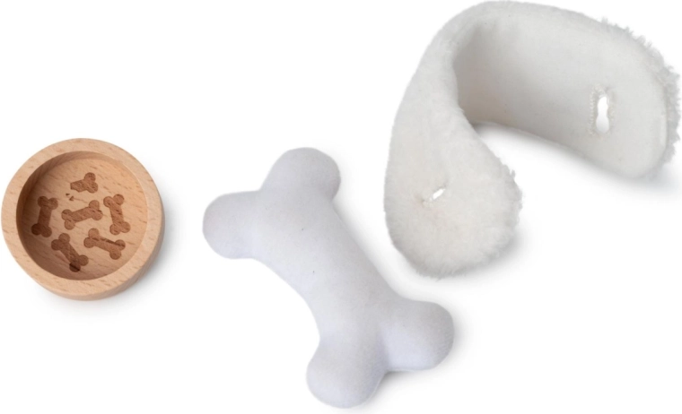 Kužek Jules ima svojo košarico, oblačilce, posodico za hrano in kost za igro, kar otrokom omogoča razvijanje številnih spretnosti: