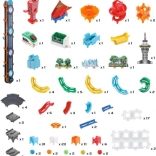Paket vsebuje 143 delov, 10 kroglic, električni vlakec z vagonom, električno dvigalo, barvne nalepke in podrobna barvna navodila v slovenskem jeziku. Stezo je mogoče povezovati z drugimi seti, zato zabava nikoli ne konča.
