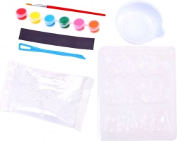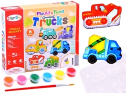 V pakiranju je vse, kar potrebuješ: posodica in mešalnik za mavec, čopič, 6 barv, magnetni trak in navodila. Ustvariš lahko do 6 izvirnih magnetkov – buldožer, žerjav, mešalec betona, valjar, bager in tovorno vozilo. Odlično darilo, ki spodbuja kreativnost, fino motoriko in potrpežljivost.