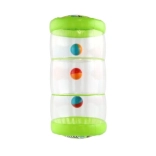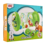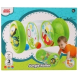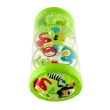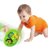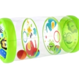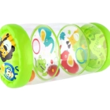 Valj je okrašen s pisanimi ilustracijami živali in vsebuje tri žogice, ki ob gibanju nežno ropotajo, kar zabava in stimulira otroke.