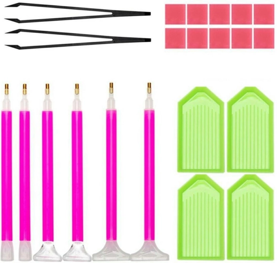 Komplet 22 dodatkov za diamantno vezenje/slikanje (diamond painting). Popoln komplet za začetek vaše avanture z diamantno mozaiko. Set vsebuje 6 peres z ročnimi nastavki, 2 pinceti, 4 pladnje za diamante in 10 kvadratkov lepila.