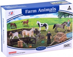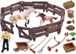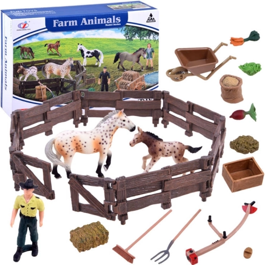 Ta bogato opremljen komplet otroke popelje v svet kmetije. Vsebuje dve verodostojno izdelani figurici konj (kobila in žrebe), kmeta, ograjo in veliko dodatkov, kot so samokolnica, vile, grablje, korito in krma. Realistične podrobnosti, od teksture »lesa« na ograji do obarvanosti konj, spodbujajo domišljijo in dolge ure igre.