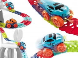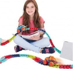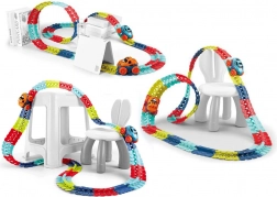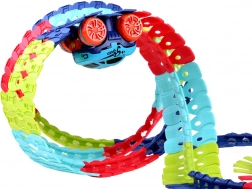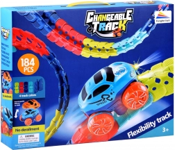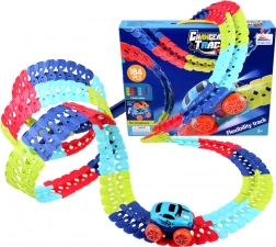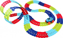 Ta barvita avtomobilska steza iz trpežne plastike je sestavljena iz 184 povezljivih segmentov, ki jih je mogoče poljubno upogibati in preurejati. Ustvarite si dinamično traso, polno ovinkov, zank in višin – vodilna letvica na sredini steze pomaga, da avtomobilček varno ostane na progi. Avtomobilček po vstavitvi 3× AAA (niso priložene) spelje z enim samim pritiskom na gumb in med vožnjo sveti z rdečo in zeleno lučjo.