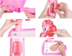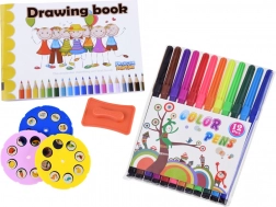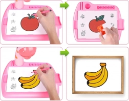 Zamenljivi diapozitivi ponujajo pisane motive živalic, vozil, sadja in zelenjave, zato si otroci vadijo ne le fino motoriko, temveč tudi prepoznavanje oblik in barv. Komplet 12 barvnih flomastrov, beležka za risanje in držala za pisala poskrbijo, da je vse pregledno pri roki.