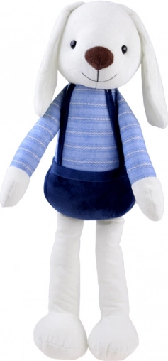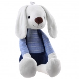 Prisrčen plišasti zajček višine 60 cm je izdelan iz izjemno mehke in prijetne tkanine. Ima plastične oči, izvezen smrček in očarljiv nasmeh. Oblečen v črtasto majico in hlače z naramnicami bo idealen prijatelj za igro, branje pravljic in crkljanje pred spanjem.