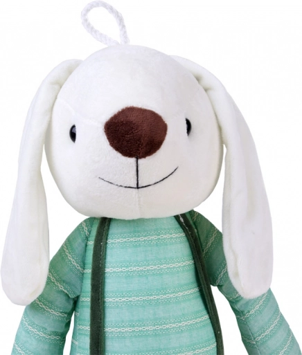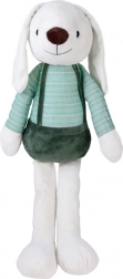 Plišasti zajček v stilskih hlačah na naramnice je popoln prijatelj za otroško sobo. Zaradi mehkega površja je odlična izbira za vsakodnevno crkljanje, skupno branje pravljic in mirno uspavanje. Črtasta majica in zelene hlače z naramnicami dajejo igrači čaroben in brezčasen videz.
