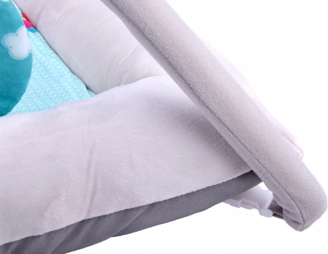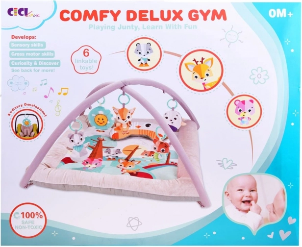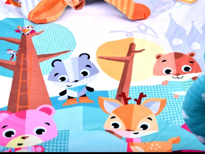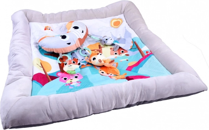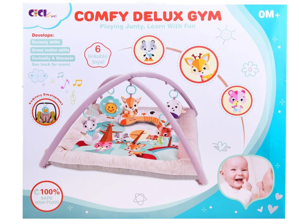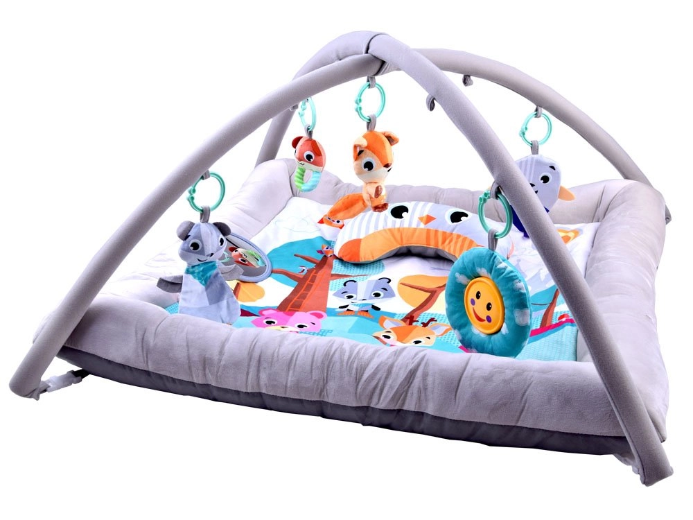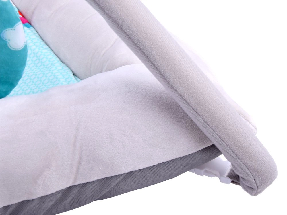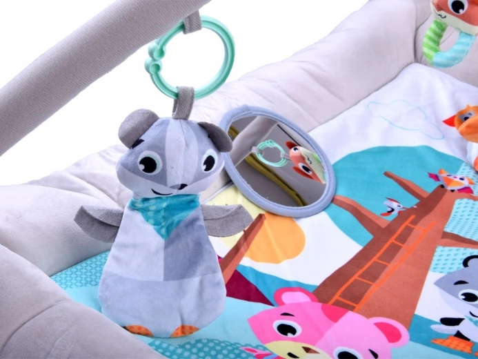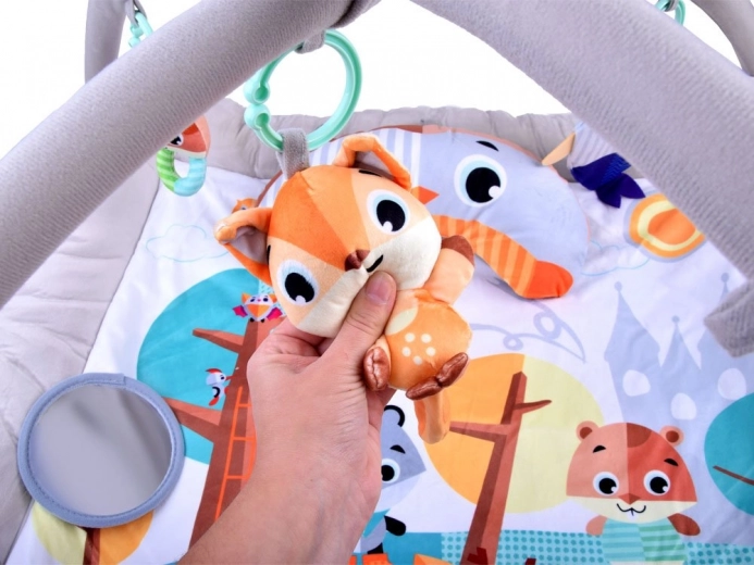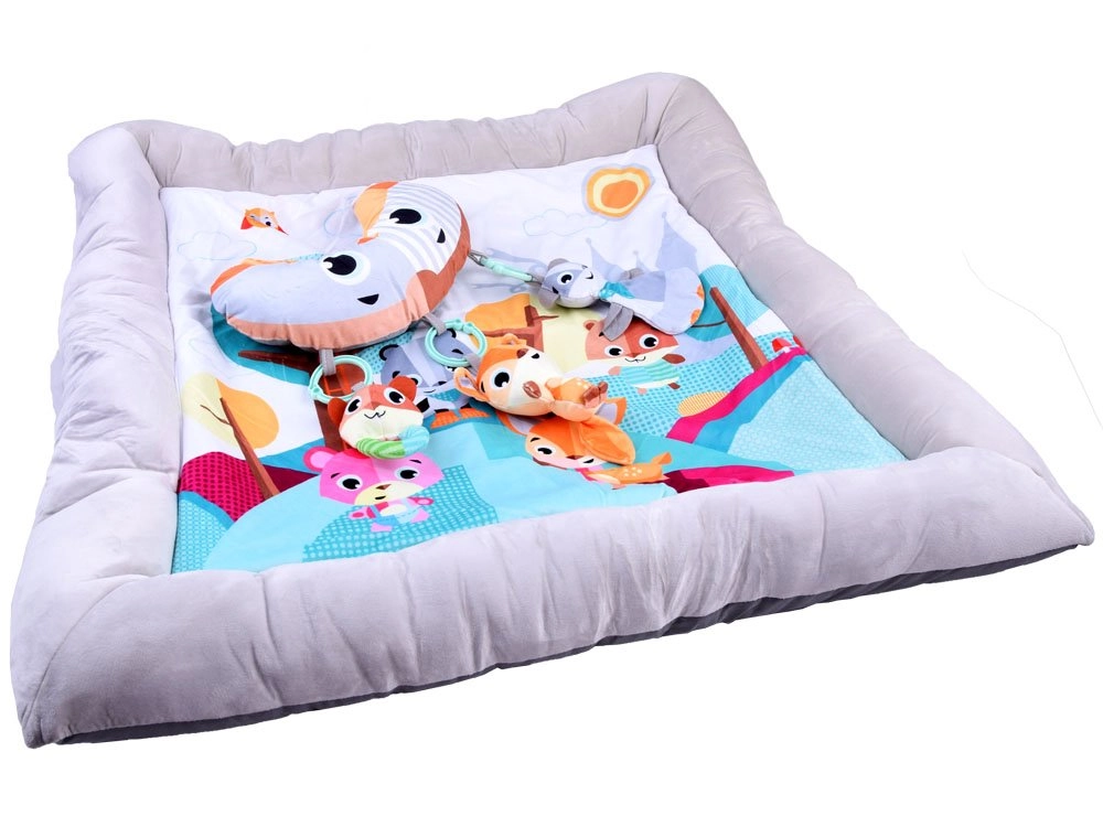 Ta ljubka in mehka igralna blazina v nežnih barvah s kontrastno grafiko je idealna za najmlajše. Dvignjeni mehki robovi povečujejo varnost pri kotaljenju, medtem ko odstranljiv lok z obročki omogoča enostavno dodajanje ali menjavanje igrač. Zahvaljujoč varnemu ogledalcu, ropotuljicam in šumečim elementom se otrok zabava in hkrati krepi svoje čute.