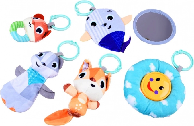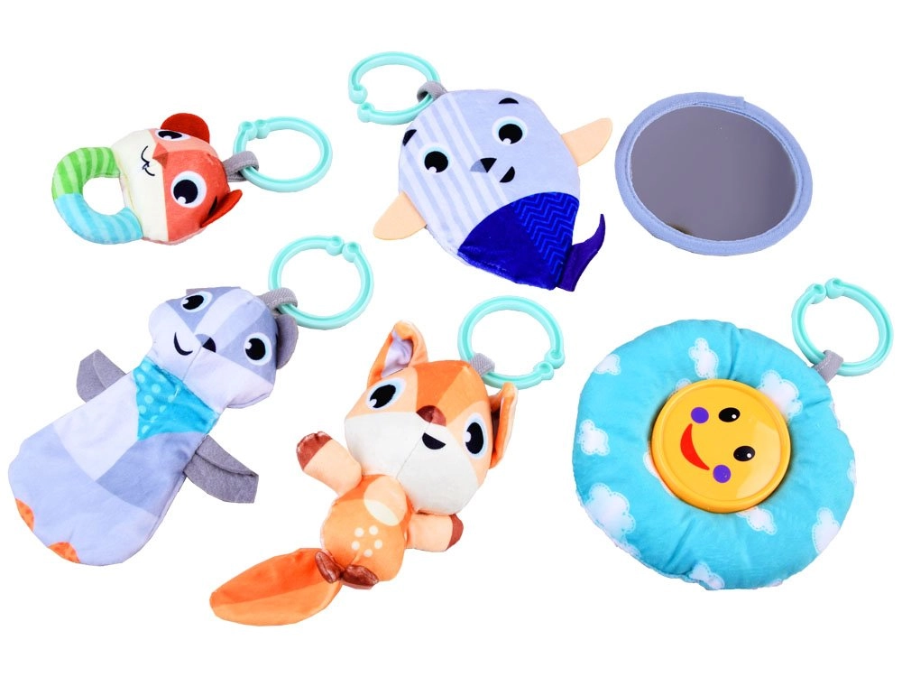 Set visečih živalic z ropotuljicami, šumečimi deli, varnim ogledalcem in sončkom z melodijo spodbuja dojenčkov vid, sluh in tip.