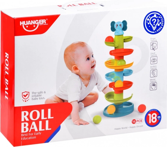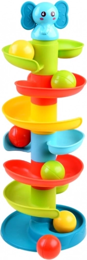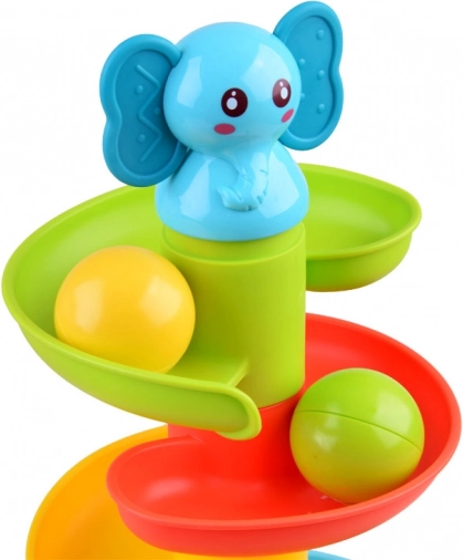 Ta barvita spiralna kroglična steza s simpatičnim slončkom na vrhu takoj pritegne otroke. Šest barvitih platform ustvari tekočo stezo, po kateri se kroglice urno kotálijo in pri tem prijetno rožljajo. Slonček ima mehko gumijasto uho, primerno kot nežno grizalo za izraščajoče se zobke.
