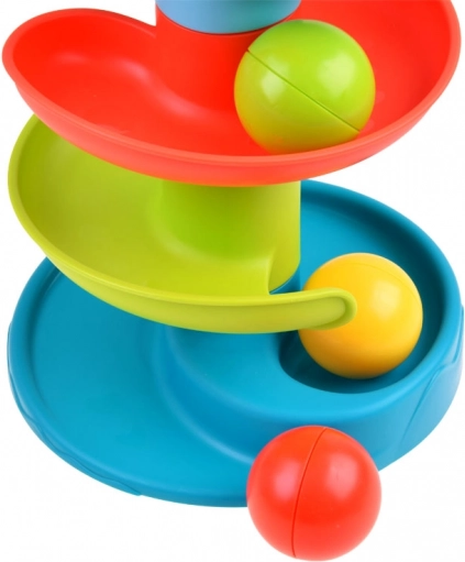 Spuščanje kroglic z vrha in njihovo lovljenje spodaj naravno uri fino motoriko in koordinacijo oko–roka, medtem ko otrok spremlja tekoče gibanje po spirali.