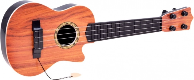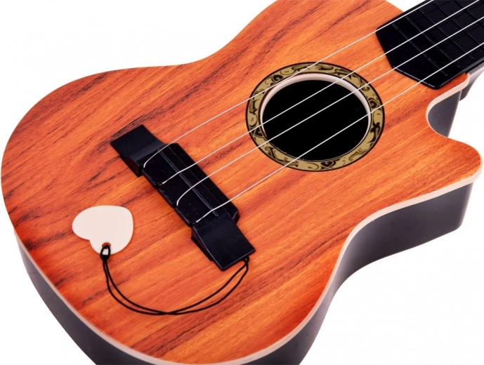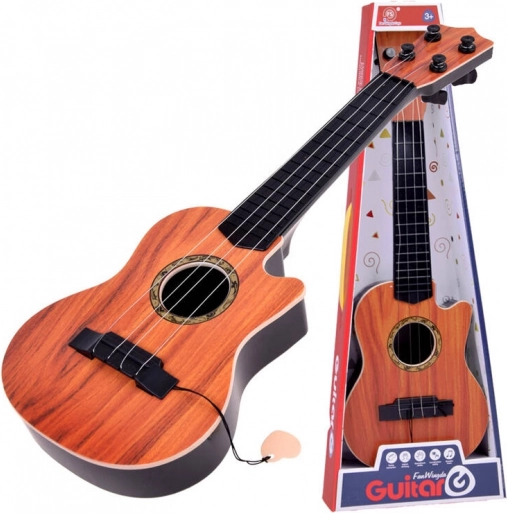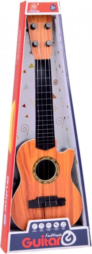 Otroška 4-strunska kitara v privlačni imitaciji lesa je zasnovana tako, da se udobno drži tudi najmanjšim glasbenikom. Štiri kovinske strune in priložena trzalica omogočajo enostavno brenkanje in učenje prvih akordov, medtem ko preprosta regulacija na vratu pomaga doseči boljše uglasitev.