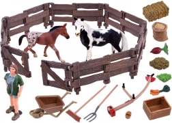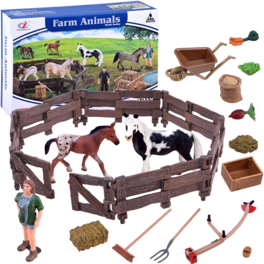 Ta celovit komplet prinaša na vašo mizo celotno sceno življenja na kmetiji. V njem najdete velikega konja, ljubkega žrebička, figurico kmeta ter vrsto orodij in dodatkov za skrb za živali. Realistični proporci, izrazite barve in natančni detajli naredijo komplet odlično igračo in izobraževalni pripomoček.