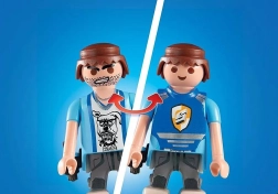 Edinstvena figurica z vrtljivo glavo in dvema izrazoma omogoča, da v hipu spremenite policista v zlikovca – idealno za pripovedovanje lastnih zgodb. Komplet spodbuja kreativnost, igro vlog in razvoj domišljije otrok.