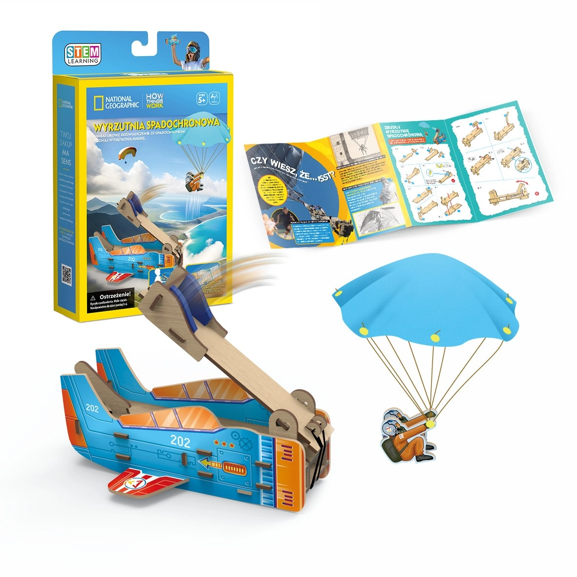 Ta komplet iz licenčne izdaje NATIONAL GEOGRAPHIC združuje kreativno sestavljanje 3D sestavljanke s preprostimi fizikalnimi načeli. Otroci korak za korakom sestavijo izstrelni mehanizem s padalom in med igro razumejo, kako delujejo zračni upor, vzgon in stabilizacija v letu.