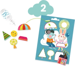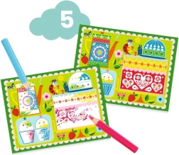 - Kolaž: 1 ilustrirana kartica, 1 predhodno izrezana kartonska plošča, 1 tubica lepila; Filcasti kolaž: 12 plošč, 4 listi samolepilnih filcastih koščkov; Color Stop: 4 ilustrirani listi, 1 šablona, 4 barvni svinčniki; Akvarelne barve: 1 kartica z belo plastjo, 1 čarobno pisalo; Razkritje barv: 3 kartice s čarobnim premazom; Praskanka: 3 kartice, 1 leseno orodje; 1 slikovno navodilo