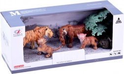 Del kompleta je celotna tigrova družina in dodatki za ustvarjanje scen: tiger, tigresa, 2 mladiča, drevesce in kamen. Odlično darilo za male ljubitelje živali in zbiratelje, ki spodbuja učenje skozi igro – otroci spoznajo, kako tigri živijo in kako izgleda njihovo naravno okolje.